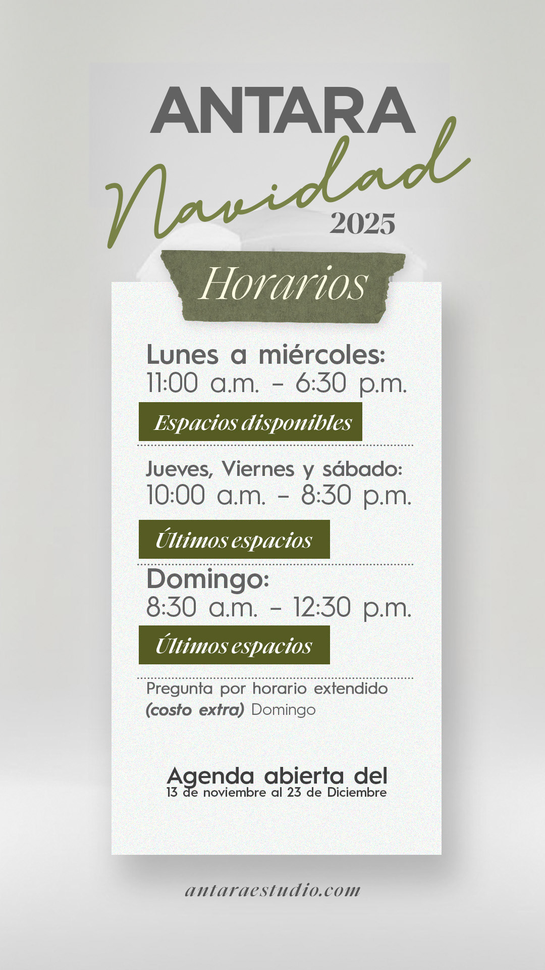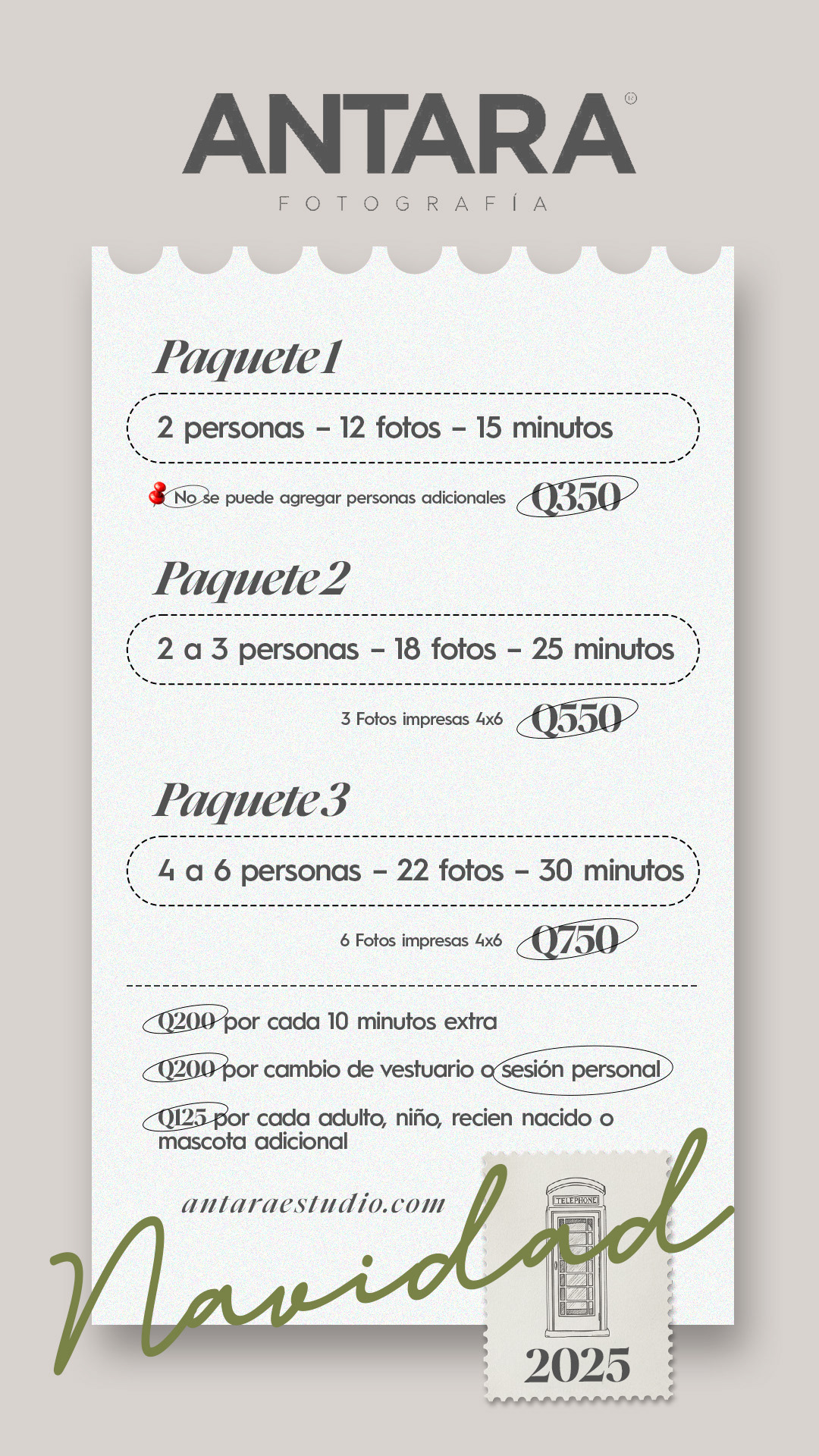 Elige uno de nuestros paquetes Nombre de la reservación Hora y fecha para confirmar disponibilidad. Confirma tu cita de cualquiera de nuestros paquetes, haciendo el depósito o transferencia de Q.200, esto con el fin de asegurar tu presencia el día de la sesión. Solicita los números de cuenta para hacer tu transferencia o depósito. Número de WhatsApp: 5466-3195 El día de la sesión de fotos se cancelará el resto del paquete solicitado.